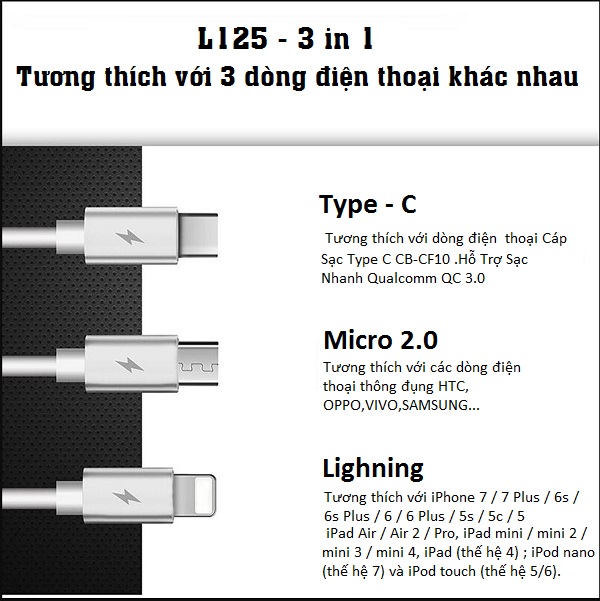 Bộ dây sạc gồm : 3 đầu sạc cho - IPhone chân cắm lighting, Android chân cắm micro usb 2.0, Type - C usb 3.1