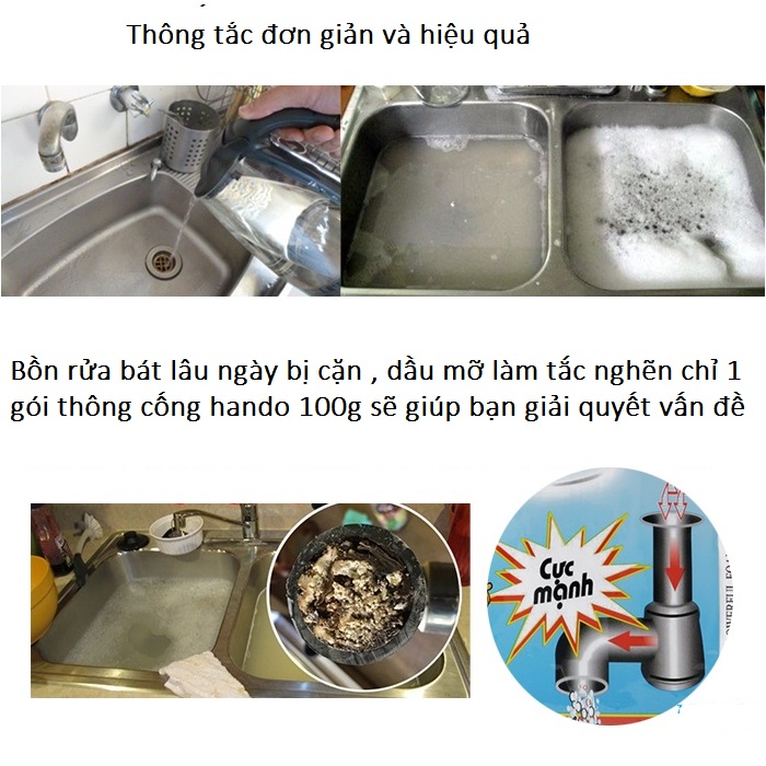 Hướng dẫn sử dụng : - Cắt chéo miệng túi, đổ hạt bột vào xô nhựa, hòa tan với khoảng nửa lít nước, đổ dung dịch vào cổ ống nơi bị tắc nghẽn