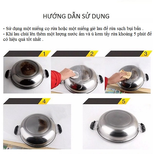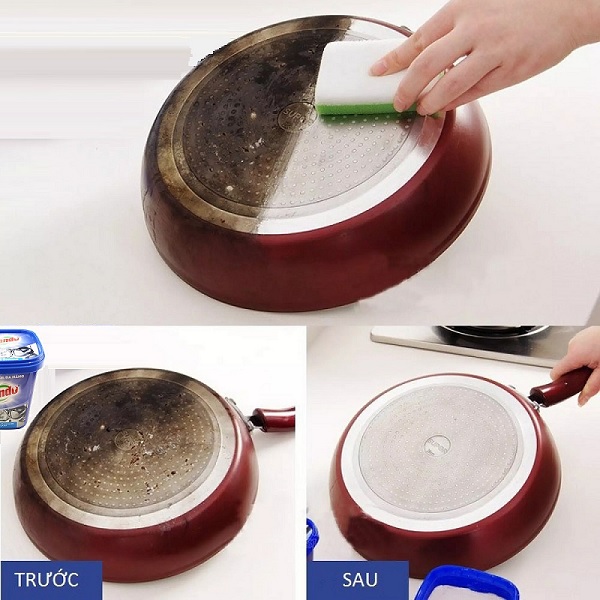 Công dụng :- Tẩy sạch các loại vết ố, vết chảy do dầu mỡ, thức ăn bám lại lâu ngày nằm trên bề mặt xoong, nồi, chảo, bếp nướng.