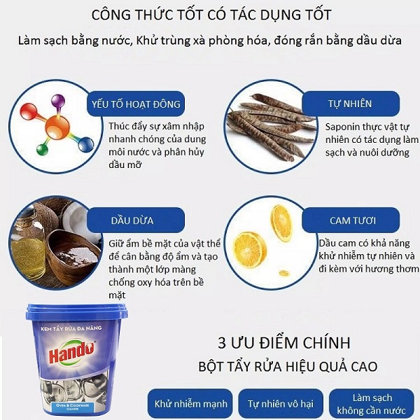 Kem Tẩy Rửa Đa Năng Nhà Bếp Oven Cookware Cleaner 500g Cao Cấp Hando được sản xuất từ những nguyên liệu vô cùng đặc biệt, sẽ giúp bạn vệ sinh sàn gạch nhanh chóng, hay bề mặt bếp, niêu chảo, bồn rửa chén, sàn gạch, chậu rửa, loại bỏ hiệu quả cao dầu mỡ và chất gỉ sét lâu ngày chỉ trong nháy mắt, tiết kiệm đáng kể thời gian và công sức cọ chùi của bạn.